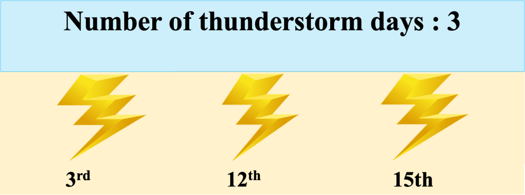 Following a long drought, we finally logged some thunderstorm days in the Bellcrest section of Toms River NJ during April 2024! Our Tempest weather station can detect lightning from thunderstorms, measuring the distance from the storm to the station. Though the system can detect lightning up to 25 miles from the sensor, thunderstorm days are counted only if the lightning is determined to be within five miles of the station (just like at airports across the country).