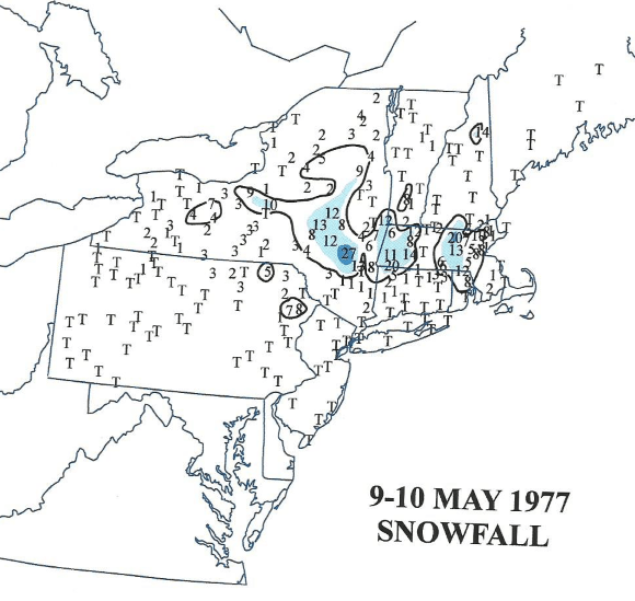 While this past weekend was wet and cool along the Jersey Shore (especially for early May), it was nothing compared to conditions associated with the latest snowfall I have seen in NJ. On May 9th-10th 1977, a winter like storm produced snow across a large section of the Northeast, including some incredible snowfall amounts over inland portions of New England. Though snowfall was scant across the Jersey Shore, I was amazed that snow could fall that late into spring near the coast.