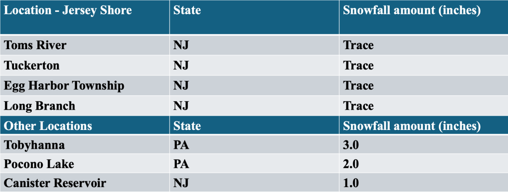 Table 1 shows selected snowfall amounts for the event. In case you were wondering, a trace of snow means that snow fell (no matter the duration), but did not accumulate on the ground. As mentioned earlier, the storm had a much more tangible impact further north, producing quite a blow to portions of inland New England (where location amounts of 24 inches were measured). Of course, it did not take much to cause a stir concerning snow in May on the Jersey Shore, but it did have a larger impact on me, as it fed my desire to one day be part of the system that monitored and predicted the weather.