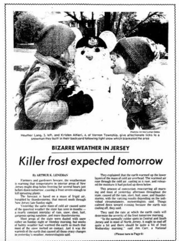 Much to my amazement, the rain changed to snow just about the time the game was supposed to have started. Seeing snowflakes in the air during May on the Jersey Shore blew my young mind, and cemented my future as a weather nerd. Though the ground was too warm for any snow accumulation, the snow fell for about 10 minutes, heavily at times, before changing back to rain before it ended. Since nobody expected anything like this to happen, my Little League was cancelled due to weather.