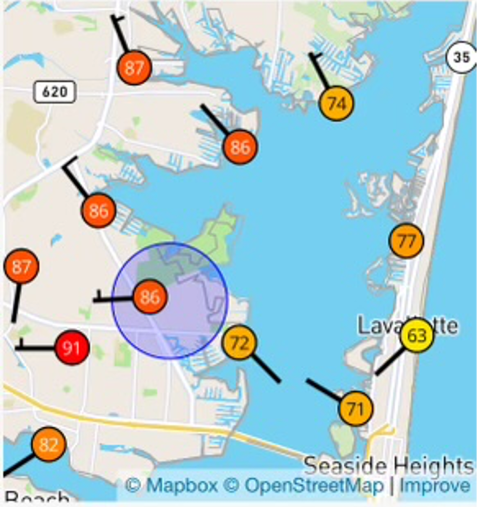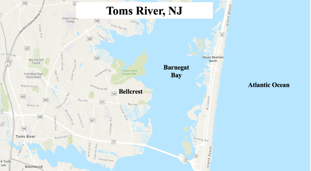 When the large scale flow across the eastern US is relatively weak (as it is during much of the summer along the Jersey Shore), sea breezes can form on consecutive days, unfolding more or less the same each day, right down to the timing of the sea breeze as it crosses the coast. When we discuss the sea breeze along the Jersey Shore, we mostly discuss it from the point of view of our weather station, which is located in the Bellcrest section of Toms River, NJ. Located less than three and one-half miles from the Atlantic Ocean along the central NJ shore, our station is often affected by the sea breeze, and occasionally is near the interaction of the sea breeze with a local bay breeze, which can result in a large difference in temperatures over a short distance.
