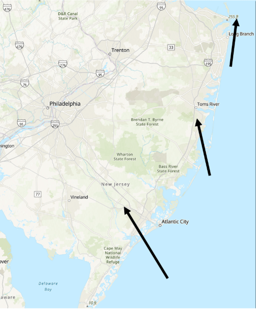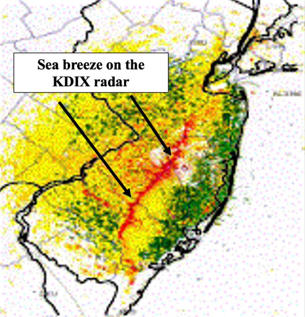 Where you are along the Jersey Shore does affect how you experience the sea breeze. Across southern NJ, the sea breeze is a southeast wind in places like Atlantic City. Closer to Toms River, the sea breeze is a south wind, and near Sandy Hook the sea breeze is a southwest wind. The change is wind direction nearly mirrors how the coastline changes from southwest to northeast, and it is though that the change in coastline changes the sea breeze direction due to something called low level convergence, which is beyond the scope of this blog entry.