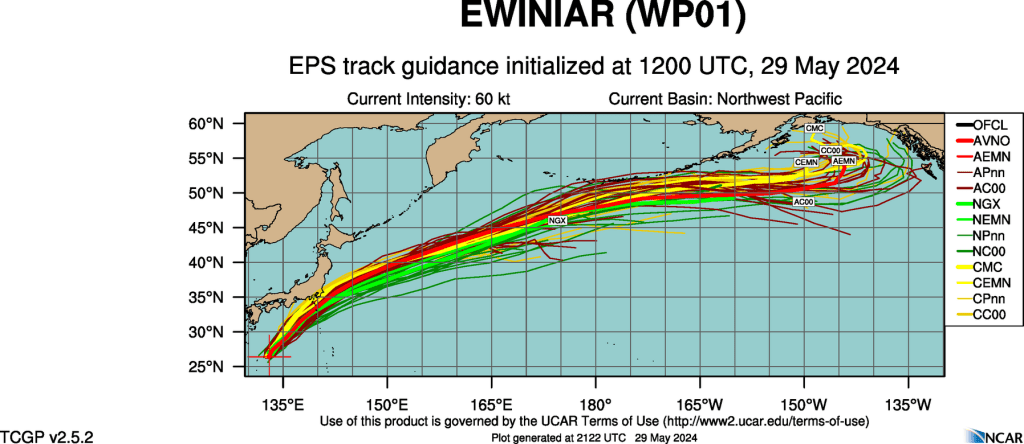 If the differences between model runs is small, it can be deduced that the initial conditions were not as sensitive as suspected. Figure 8 shows an ensemble forecast for a tropical system in the western Pacific. Note that the tracks are quite similar, suggesting that initial conditions did not have a large impact on how the models are handling the system, lending confidence to the overall forecast. Greater “spread” (difference in the storm track) would indicate that the system is sensitive to initial conditions, lowering forecaster confidence in the system (for now).