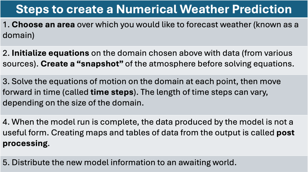 Please be aware: These steps cover the very basics about how forecast models create information for forecasting the weather. Since there are sources of error introduced throughout the process, different entities wishing to produce weather forecasts use different approaches when it comes to how to initialize data, choosing the size of the domain and how far our in time to run the model. Because of these differences, there are many applications of numerical weather prediction when it comes to forecasting the weather.