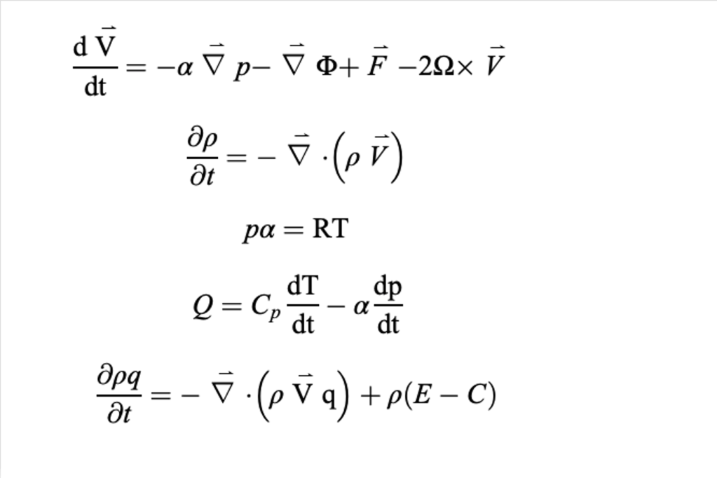 At their simplest, weather forecast models are a collection of programs that collect data, ensure it fits a prescribed format, then feeds the data into a program that solves equations that govern the how air moves through the atmosphere. At their most complex, weather forecast models contain many modules that perform the above tasks on scales as large as the planet, and as small as a US state or two. At their core, weather forecast models solve the equations across the size of their domain (size of the map over which they are working) across three dimensions and time steps until they reach the end of the predetermined time for the forecast to end.