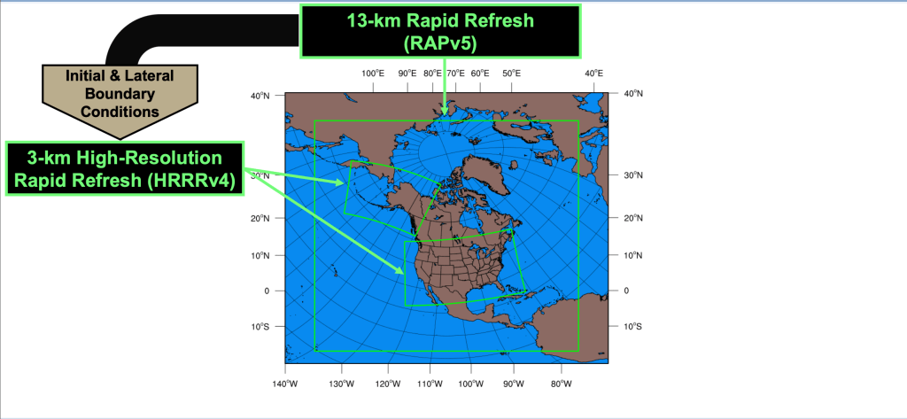 Most forecast weather models are run by government entities or universities testing new ways of initializing data or different ways to show the data (known as data visualization). In the United States, the National Weather Service runs models as large as the Global Forecast System (GFS), which forecasts weather for the entire globe, the North American Model (NAM), which forecasts for mainly North America, and much smaller models such as the High Resolution Rapid Refresh (HRRR), which runs hourly over a subset of North America. Each of these models excels during portions of the forecast process, while others are used to fine tune the solutions of the larger model forecasts.
