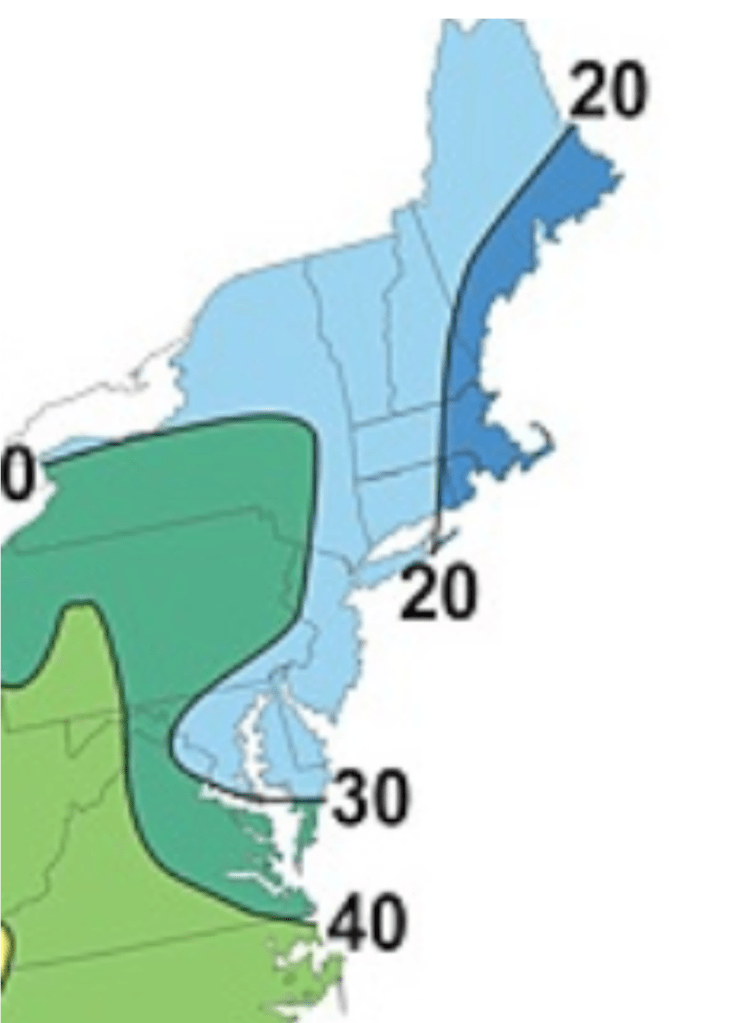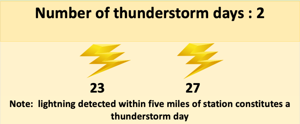 However, the number of thunderstorm days (days during with our Tempest Weather station logged lightning strikes with five miles) increased markedly during June and July 2023, when eight thunderstorms were noted for each month. Rutgers University recently published a map showing the average number of thunderstorm days per year for a large chuck of eastern PA and NJ, and the numbers we tallied from 2023 were close to these values.