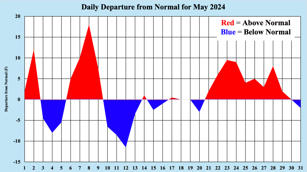 During the below normal periods of May 2024, the winds came from the northeast or southeast, ushering in still cool temperatures residing over the ocean. Though May often contains the first 90 degree reading of the year (as it did during 2024), it is also not unusual to experience days during mid and even late May that feature high temperatures closer to 60 degrees. However, as it often the case, the last 10 days of the month were more consistent with higher than normal temperatures, tipping the monthly temperature above normal for the month.