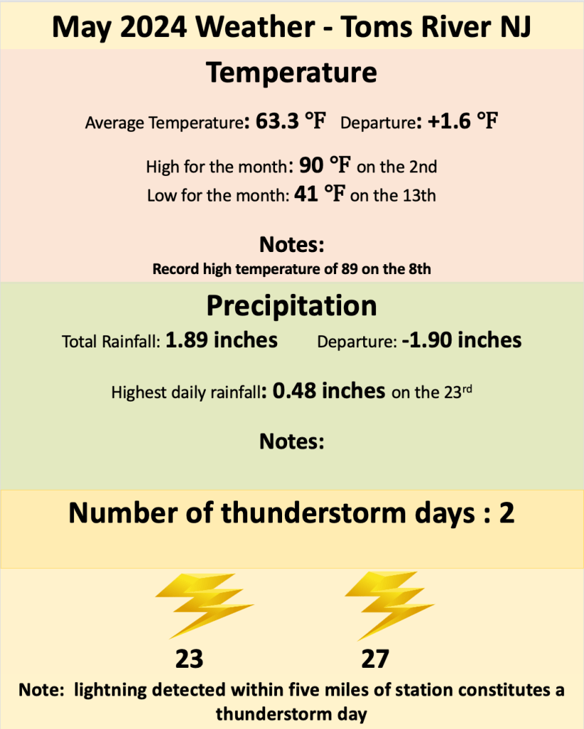 May 2024 was warmer than normal in the Bellcrest section of Toms River, NJ, and much drier than normal, despite an unusual number of rainfall events for the month. As is often the case during the spring on the Jersey Shore, there were strong variations in temperatures, with the last third of the month experiencing above normal temperatures. The warm weather was counteracted by cooler temperatures for much of the middle of the month, so for the month May averaged just above normal. Rainfall was much below normal, which is also not unusual for May, as the transition from winter rain to thunderstorms often results in lighter rainfall amounts for the month. Despite the lower rainfall amounts for the month, rain was observed for nearly half of the days on the month.