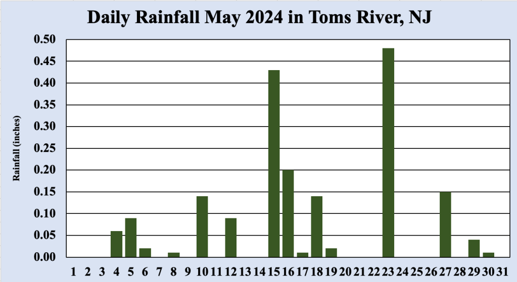 Unlike most months since late last fall, rainfall in the Bellcrest section of Toms River was much below normal. May 2024 was the first month since February 2024 not to have any daily rainfall records, and the highest rainfall for any calendar day during the month was about one-half inch (on the 23rd). While the average monthly rainfall for May is about three and three-quarters of an inch (3.87 inches), about one-third of the Mays in our database had monthly rainfall amounts much less than this.