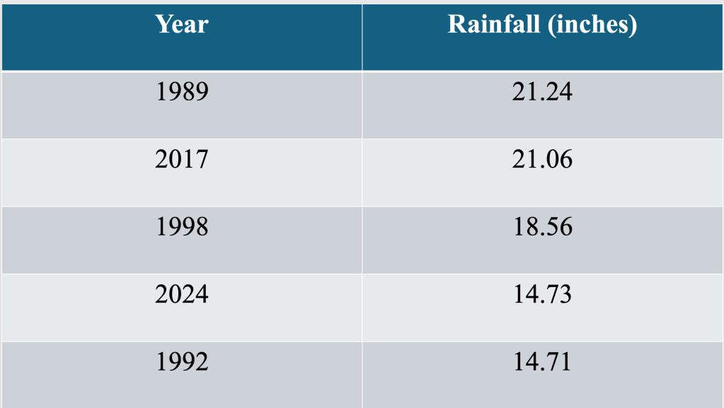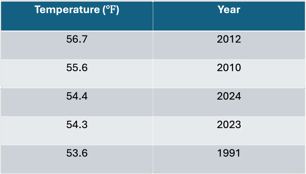 Overall, spring 2024 was the fourth warmest spring on record at this location, impressive because almost all of this warmth occurred during March 2024, not May 2024 as might be expected. In fact, the most rainfall and warmth occurred in March, as if the spring roared in like a lion and limped out as a mouse.