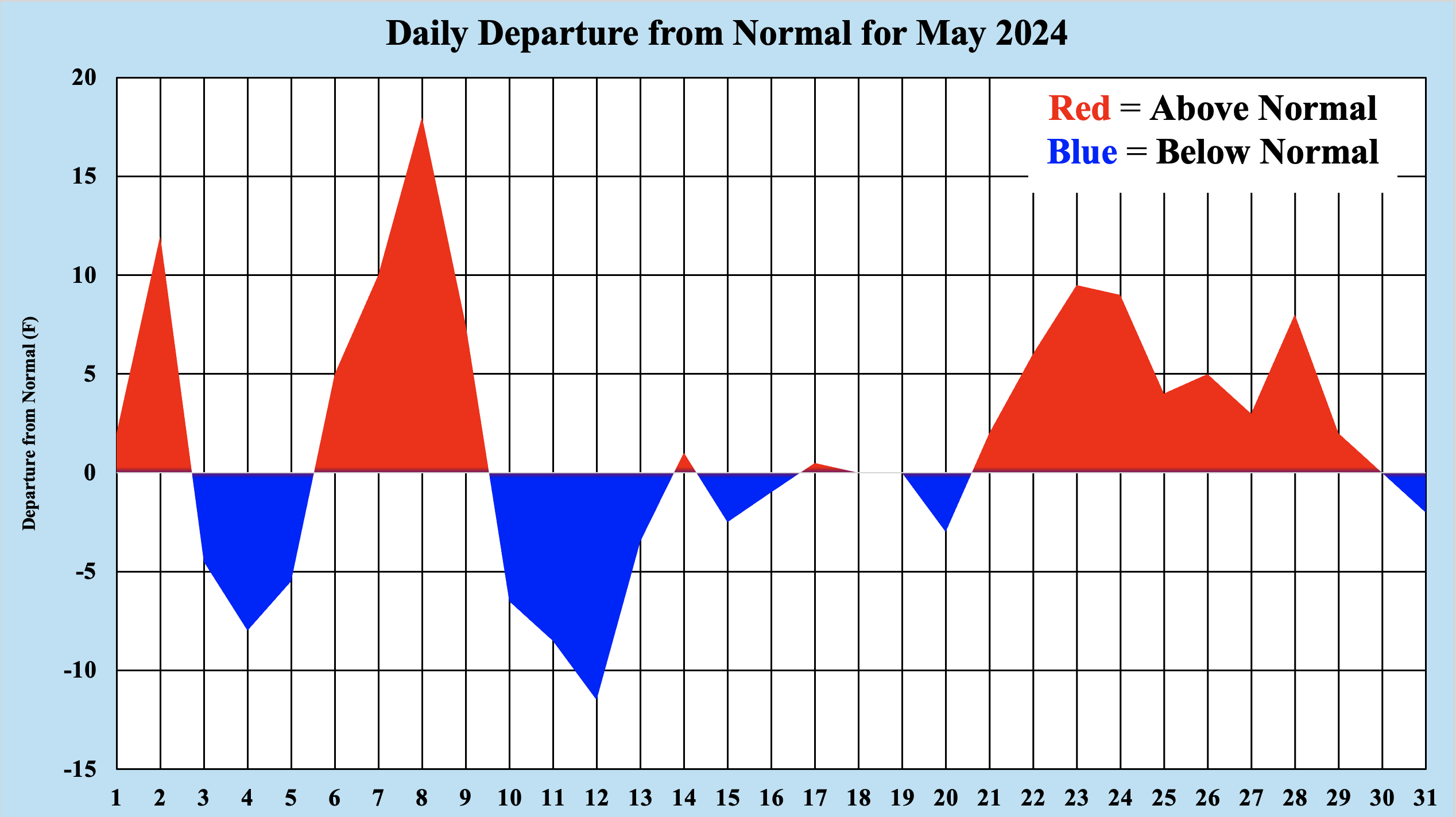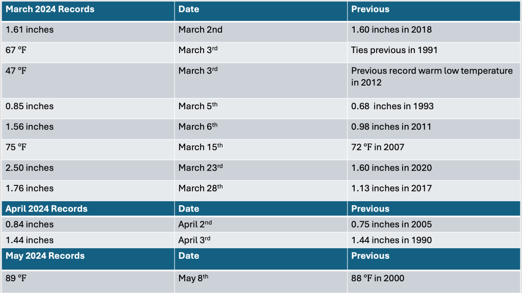 A quickly changing pattern from mid April through the end of May kept rainfall amounts relatively light, and no additional rainfall records were set during this period. Though rainfall amounts were below normal for May, we logged 15 days of rainfall during the month, or rainfall every other day. Typically, rain falls 11 days during the month, and despite more rainfall events, May 2024 remained below normal for total rainfall. This was again due to the fact the most system were fast moving, unable to tap deeper moisture for heavier rainfall.