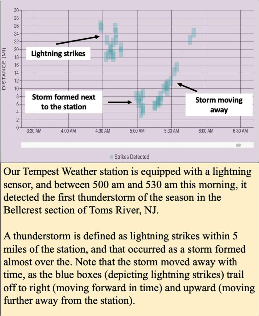 Following the six month stretch of no thunderstorms reported by our station, the first thunderstorm of the year was detected during the early morning hours of April 2nd 2024! For our purposes, a thunderstorm is defined as lightning strikes with 5 miles of our Tempest Weather station, which can detect lightning strikes up to 25 miles away. During this event, storms formed almost directly over the station before moving over the ocean and dissipating. We have seen as many as 3000 lightning strikes in a three hour period of storms last summer.