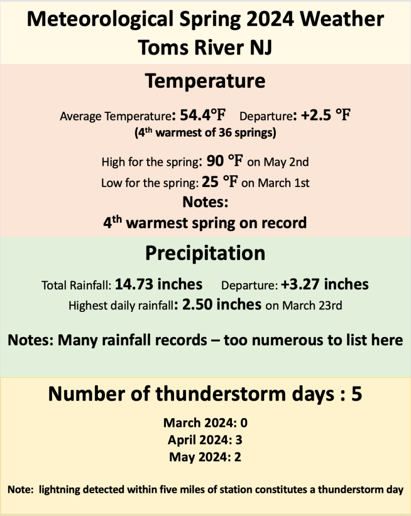 Only one daily record high temperature was established during this time, when temperatures reached 89 degrees on May 8th 2024, just nudging out the previous record of 88 set back in 2000. May 2024 also brought the first 90 degree temperature of 2024 to the Jersey Shore, when our station logged a high temperature of 90 degrees on May 2nd. Normally our first 90 degree occurs closer to Memorial Day.