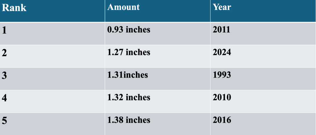 This was the second longest rainfree streak in June at this location, bested only by the 18 day streak occurring in 2010. So far, 1.27 inches of rain has been recorded by our station in June, which represents the second driest June on record for this location (the driest June happened in 2011, when a scant 0.93 inches of rainfall was logged). However, rainfall ahead of the cold front Wednesday afternoon into Wednesday night could knock June 2024 out of the top five driest Junes on record.