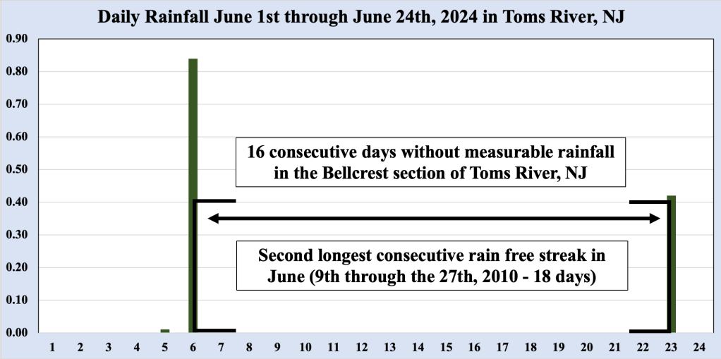 Ahead of the front, deeper moisture funneled into the region is expected to support thunderstorm development, which likely peaks Wednesday afternoon into late Wednesday evening. Rainfall amounts could top an inch for portions of the Jersey Shore during that time frame, as clusters of storms track over the region. Thus far during June 2024, rainfall has been fairly scarce, and the rainfall that occurred Sunday night was the first measurable rainfall in the Bellcrest section of Toms River, NJ since June 6th, a span of 16 consecutive days without rain.