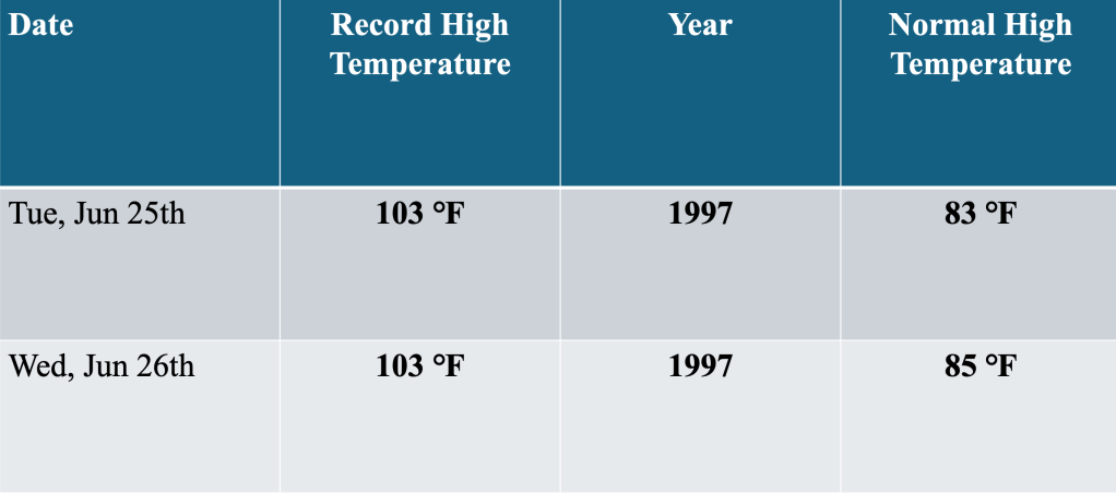 Though high temperatures in the 90s is still above normal for the region, the high temperatures on Tuesday and Wednesday are expected to remain well below record levels. Record high temperatures each day (103 F) are about as high as they can get for late June, and should be well above the high temperatures expected during the mid week.