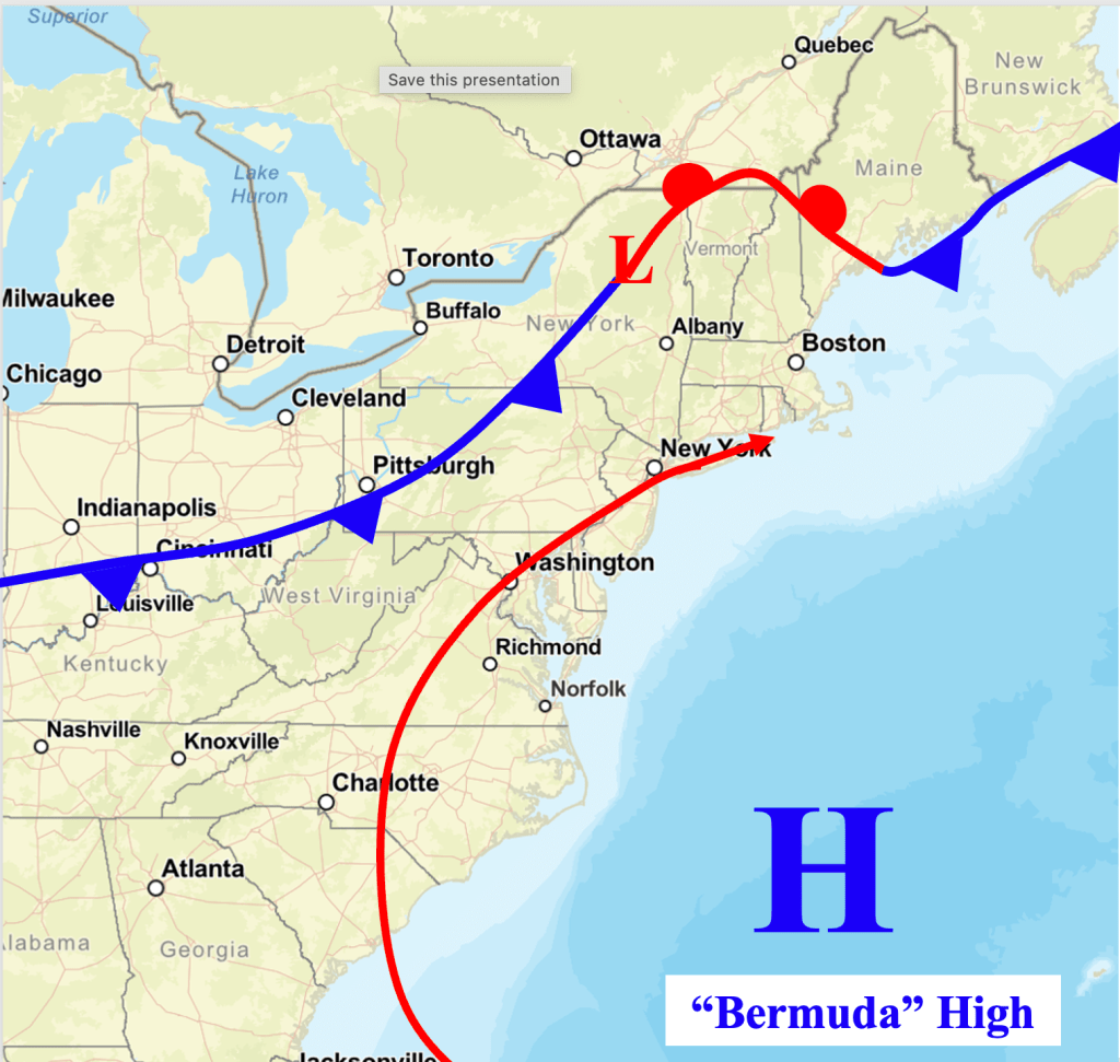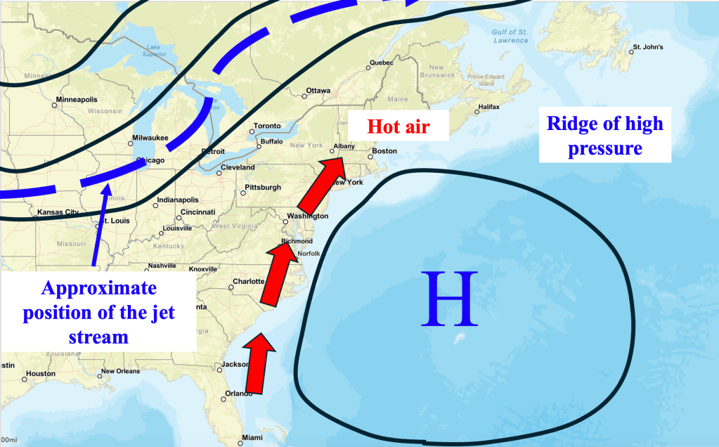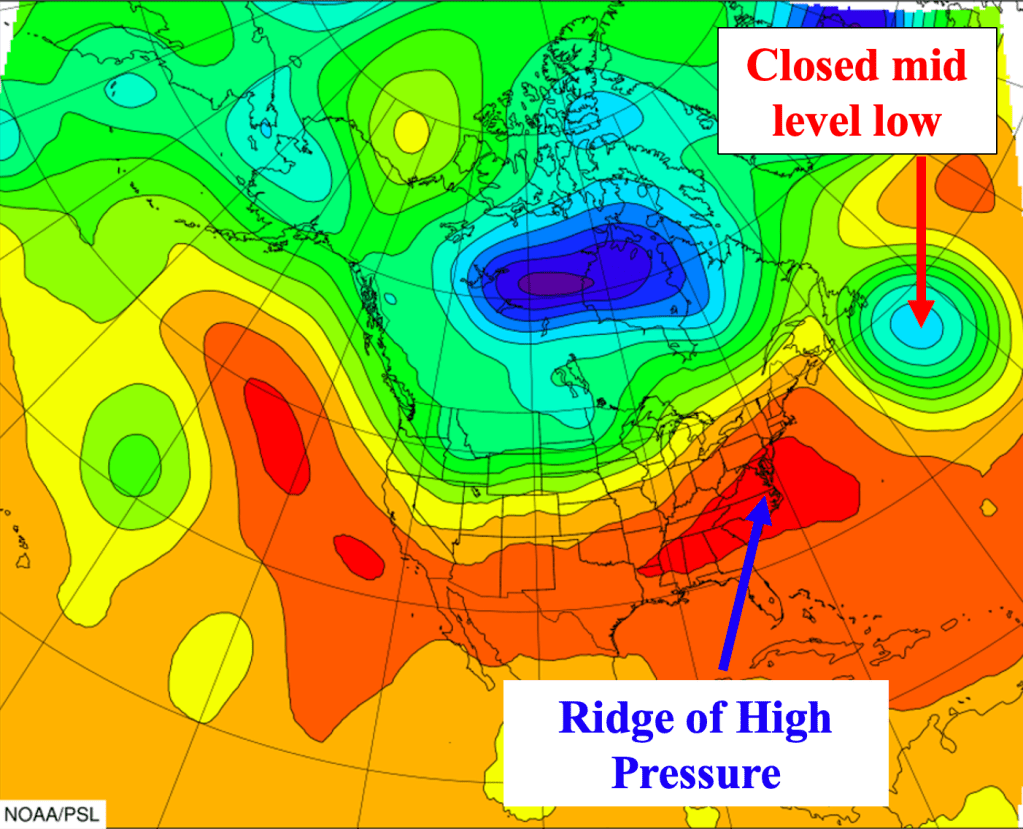 In the mid levels of the atmosphere, high pressure was in place along the Mid Atlantic coast, which allowed warming and drying of the air transported into NJ as it descended into the region. This ridge of high pressure was especially strong, extending from NJ southwest to the Gulf States, held in place by a closed mid level low well southeast of Labrador Canada. Known as a blocking low, these systems become “cut off” from the main flow and tend to move slowly. As long as the blocking low was in place, the mid level ridge in place was unable to exit, extending the heat through five days.