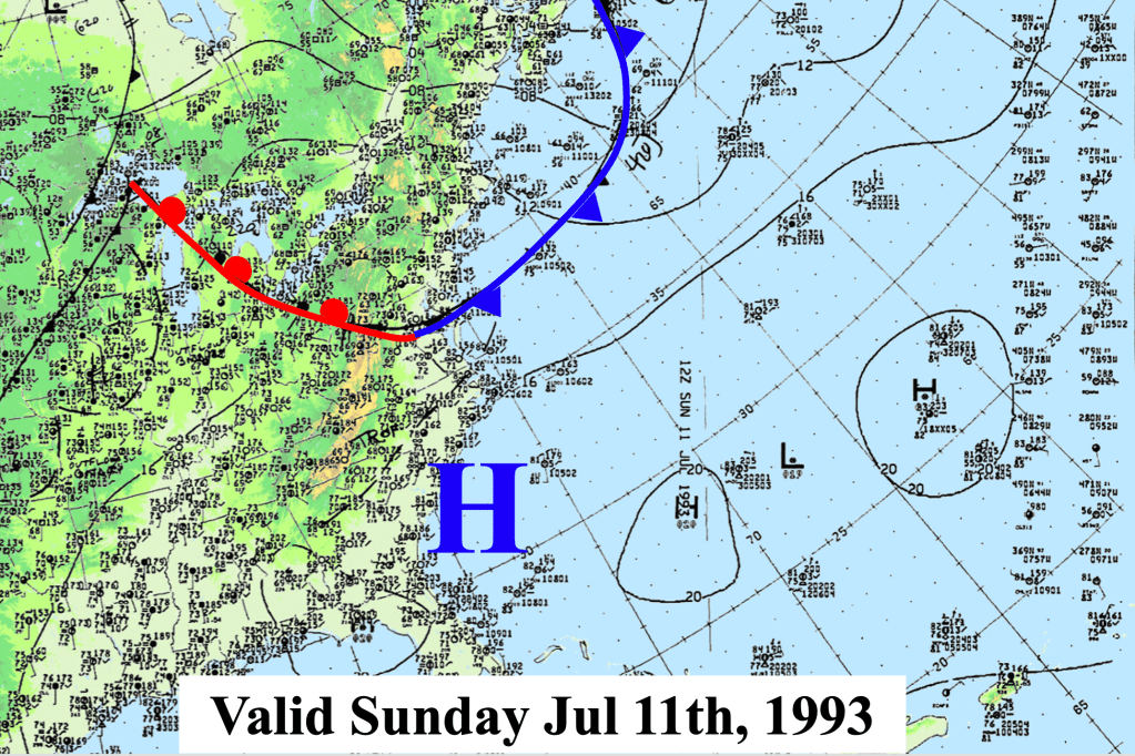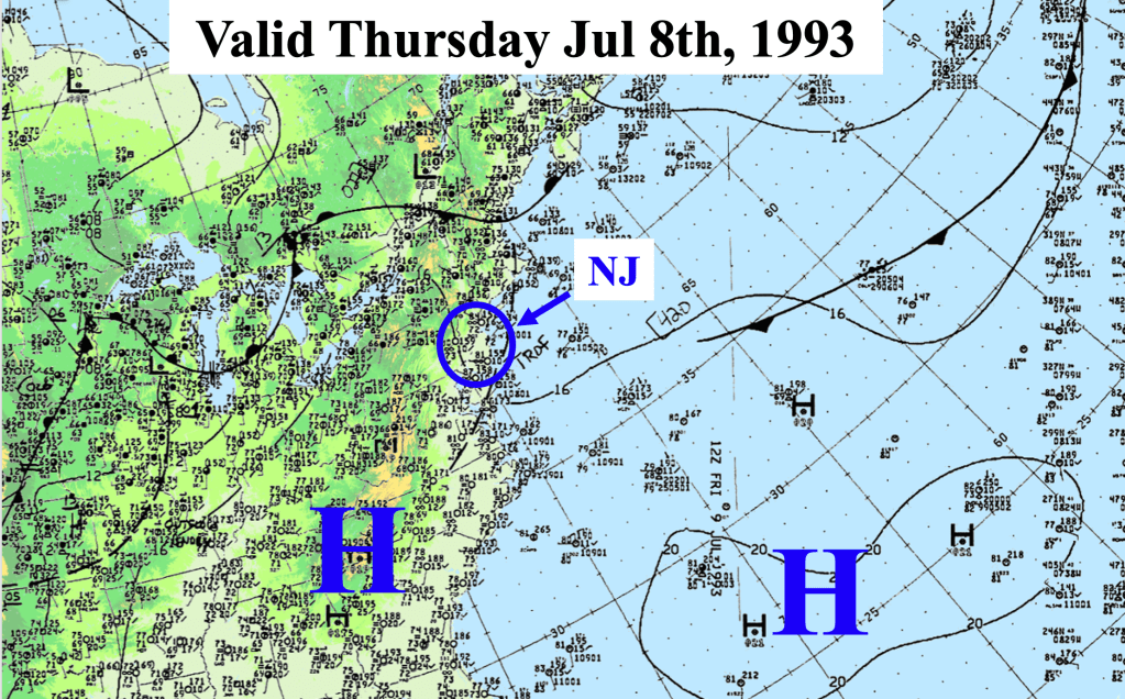 By the morning of July 8th, 1993, conditions had developed to support the beginning of a hot spell for much of the Mid Atlantic And Northeast. Bermuda High pressure in position produced a strong enough opposing flow to ensure that the sea breeze would remain offshore, allowing coastal sections to heat up as much as places further inland.