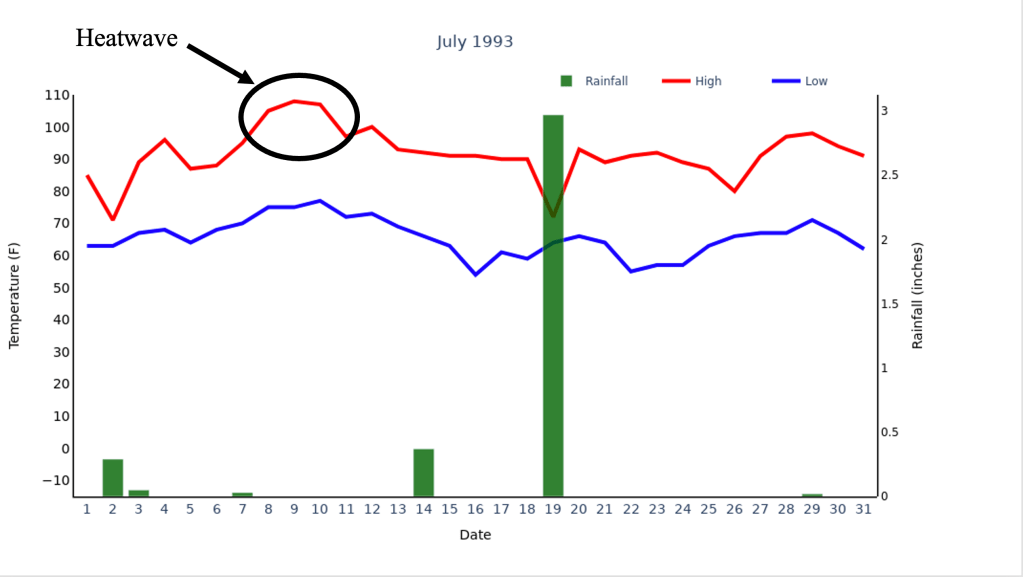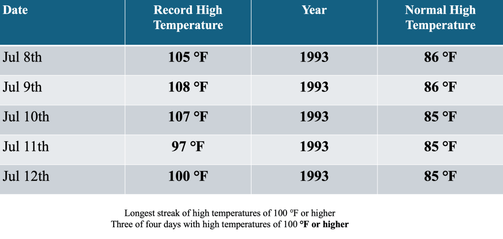Though temperatures for the remainder of the month averaged above normal, the month itself was NOT one of the five hottest months of July for our station. Given the length and intensity of the heatwave, it seemed assured that July 1993 would take its place as one of the warmest (if not THE warmest July ever). Surprisingly, some of the effects of the heat were mitigated by the fact that low temperatures were actually below normal for the month, which provided some mitigation of the hot days.