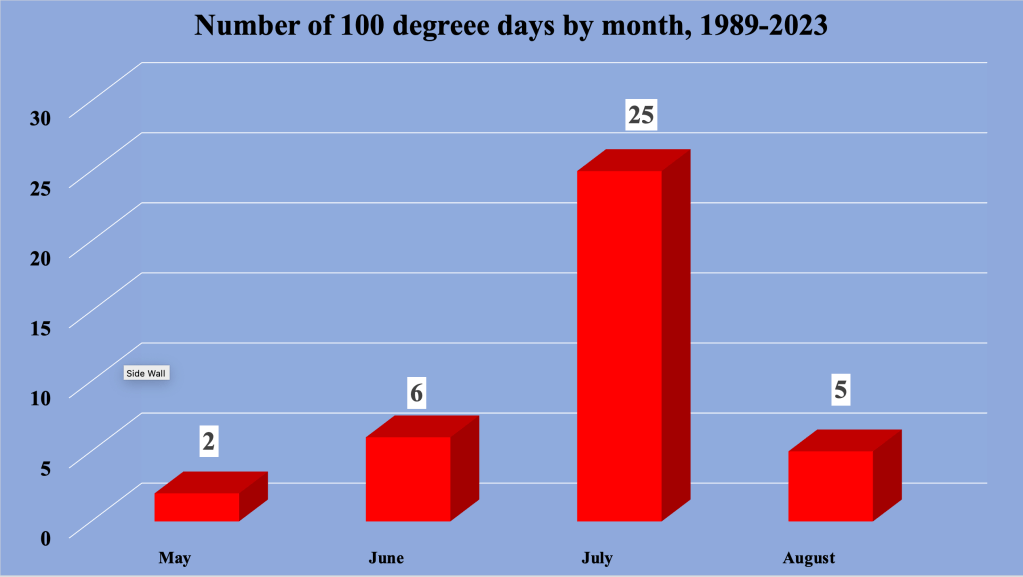 Just how often do high temperatures equal or exceed the 100 degree mark along the Jersey Shore? During the period 1989-2023, high temperatures of 100 degrees or higher occurred 38 times, or about once a year. However, this statistic can be misleading, as 100 degree days do not often happen as a singular event; instead, they can occur in pairs, distorting the average to some degree.