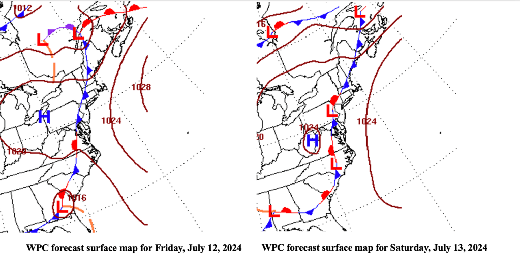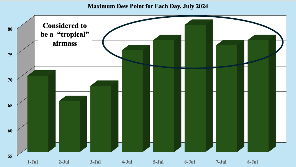 Except for a couple of less humid days near the beginning of the month, July 2024 has been very warm and humid. Figure 1 shows the maximum dew point recorded for each day at our station in the Bellcrest section of Toms River, NJ this month. Generally, any time the dew point rises above 70 degrees F along the Jersey Shore, the airmass is considered tropical, with a source across the Southeast US and the western Atlantic Ocean.