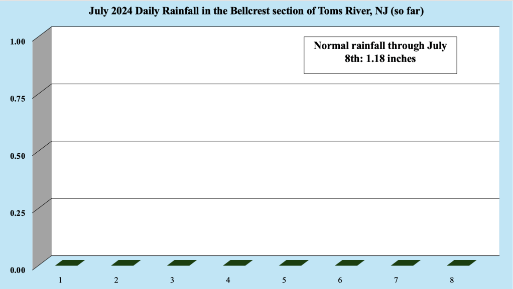 Despite the warmth and humidity, July 2024 has thus far been dry across much of coastal NJ. Some locations has seen scattered thunderstorms with locally heavy rainfall, but many have seen no rain since the end of June. Our station has not received any rain this month, with the latest current rain free streak sitting at eight days. Long rain free streaks have been common this year, starting in March 2024 and continuing in June 2024. Sporadic rainfall has resulted in much of the area being classified as abnormally dry, which is generally not good considering rainfall during the summer months is wholly dependent on thunderstorm activity.