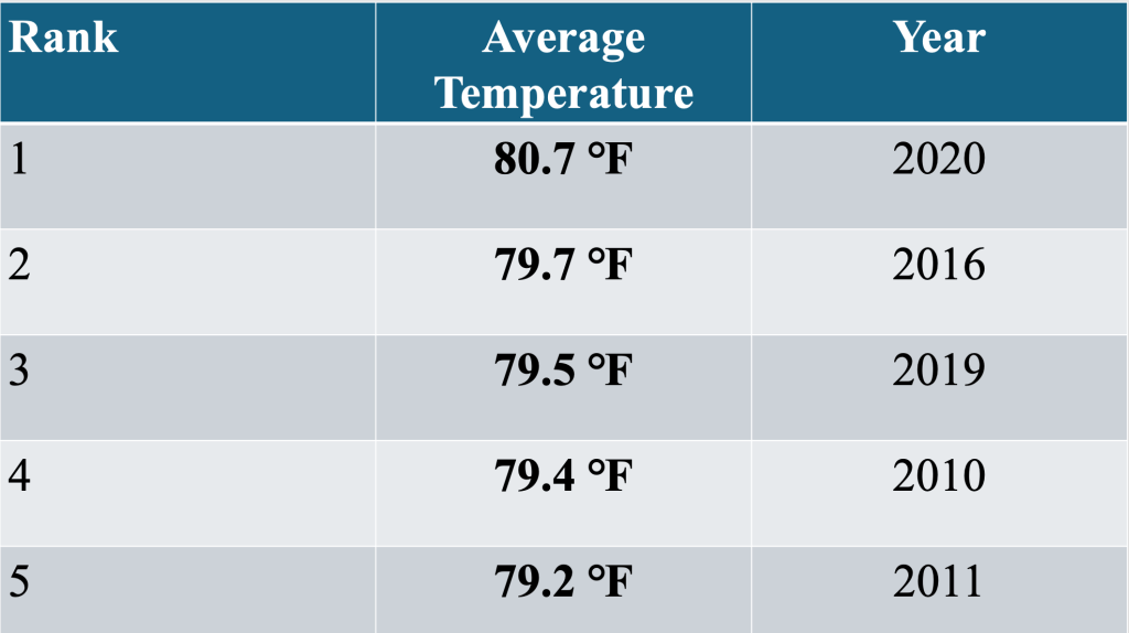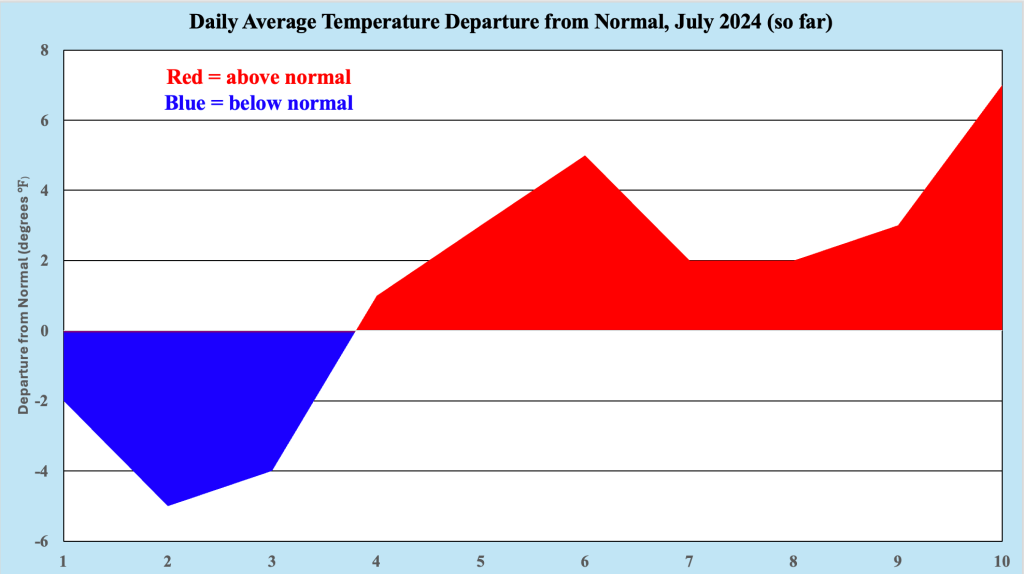 While the average monthly temperature for July 2024 is fairly close to normal (due in large part to the cool start), the combination of the current heat wave and the approaching heat wave could boost that value considerably by this time next week. The warmest July on record occurred in 2020, with a monthly average of 80.7 degrees, the only month with an average temperature that high at our location. That value seems out of reach, but depending on how warm next week becomes, a top five warmest July is possible.