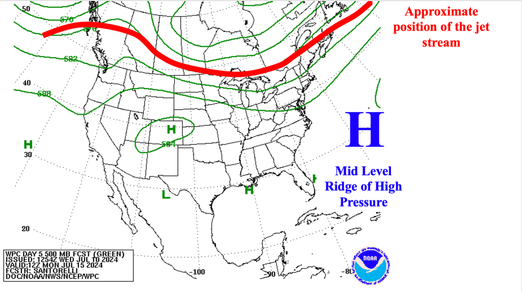 Figure 2 shows the expected positioning of the mid level features across North America early next week. Note the large mid level high pressure system (also referred to as a mid level ridge), providing an environment of sinking air to much of the East Coast, pushing the jet stream back toward the US/Canada border. At the surface, high pressure anchored off the Mid Atlantic Coast (known as a Bermuda High) brings a broad southwest flow of hot and humid air to the East Coast as well, locking in the heat into the middle of next week. Unlike this past encounter with heat and humidity, the Jersey Shore may see temperatures warmer next week than this week, as the sea breeze may be less likely to have significant effects on high tempeatures.
